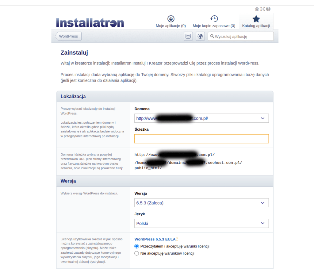 • W polu Ścieżka podajemy w jakim katalogu zainstalować stronę - zalecamy zostawić puste - zostanie zainstalowane w domyślnym katalogu.