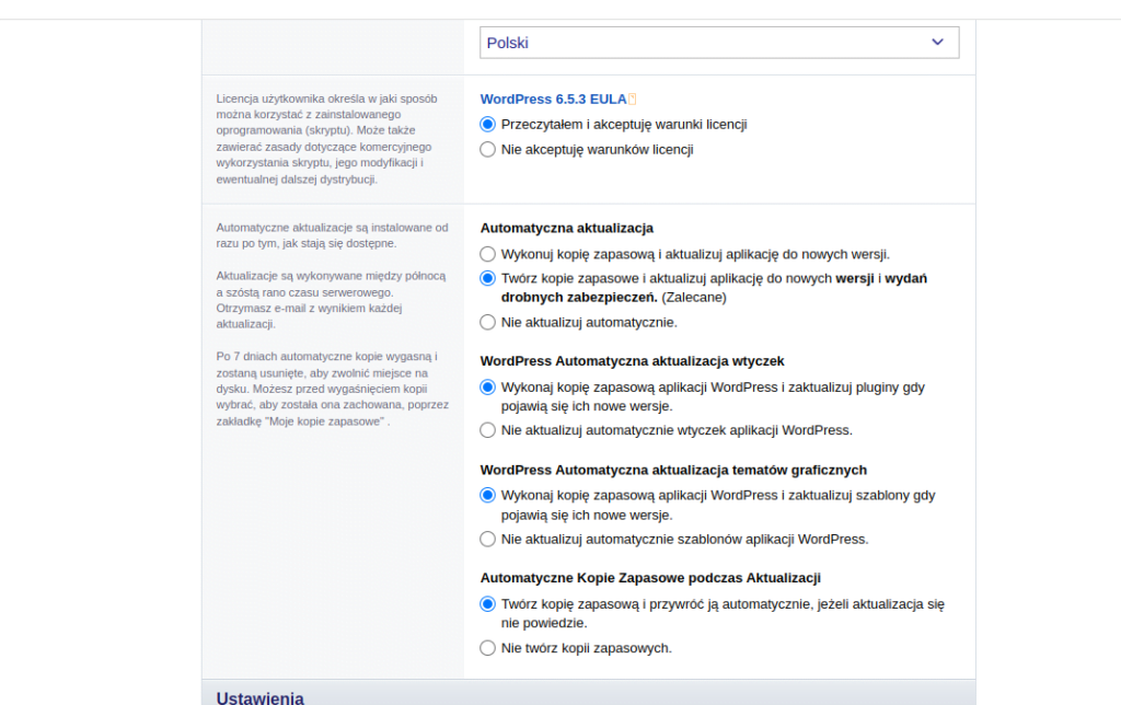 • W następnej sekcji wybieramy opcje dotyczące automatycznej aktualizacji, możemy zostawić domyślne ustawienia, wtedy silnik strony, wtyczki i motywy będą się aktualizować automatycznie, uprzednio wykonując kopię zapasową, w większości przypadków takie ustawienie będzie odpowiednie dla początkujących użytkowników.