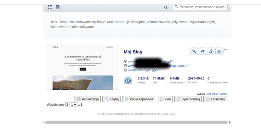 • Koniec! Nasz Wordpress jest zainstalowany. Widzimy ekran jak poniżej, po lewej stronie mamy podgląd naszej strony(domyślny szablon), dalej nazwę naszej strony(mój blog), 4 ikony(edycja danych podanych podczas instalacji, ręczna kopia zapasowa, klonowanie czyli stworzenie duplikatu naszej strony - przydatne gdy chcemy edytować i sprawdzać nie koniecznie na stronie produkcyjnej, oraz usunięcie strony). Poniżej są 3 linki, pierwszy prowadzi do naszej strony, drugi do panelu administracyjnego, a trzeci do supportu wordpresa.